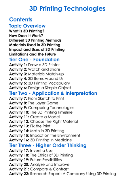 3D Printing Technologies Worksheet Activity Booklet