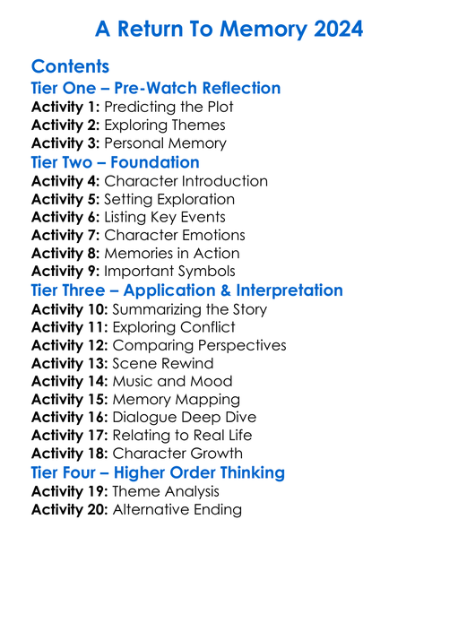 A Return To Memory 2024 Worksheet Activity Booklet