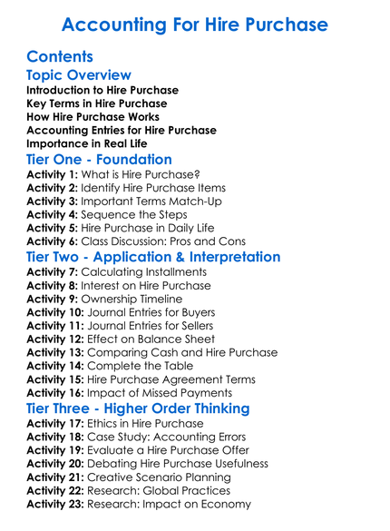 Accounting For Hire Purchase Worksheet Activity Booklet