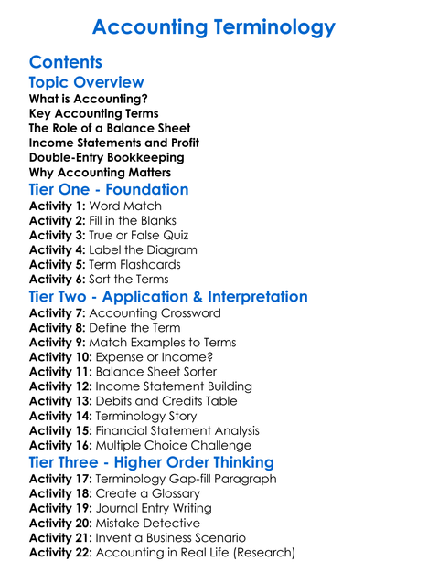 Accounting Terminology Worksheet Activity Booklet