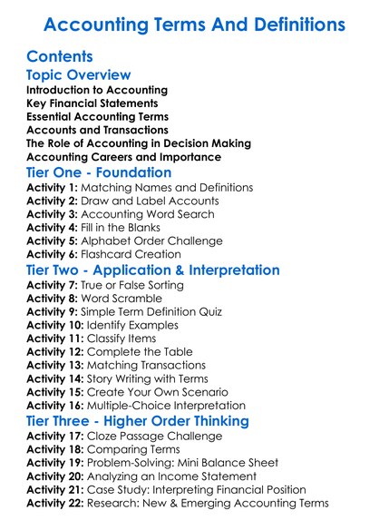 Accounting Terms And Definitions Worksheet Activity Booklet