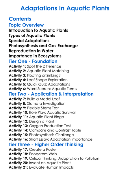 Adaptations In Aquatic Plants Worksheet Activity Booklet