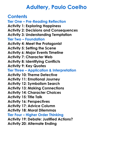 Adultery Paulo Coelho Worksheet Activity Booklet
