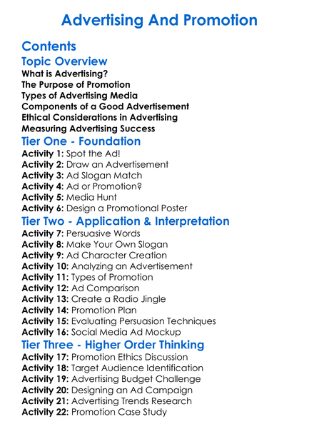 Advertising And Promotion Worksheet Activity Booklet