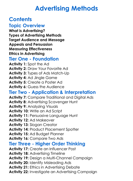 Advertising Methods Worksheet Activity Booklet
