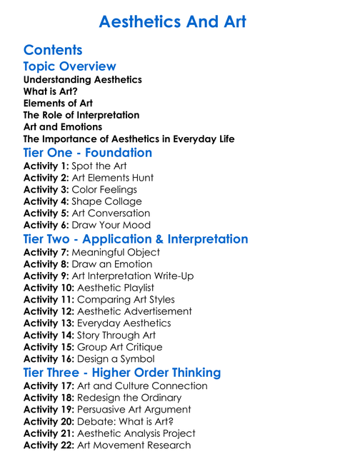 Aesthetics And Art Worksheet Activity Booklet