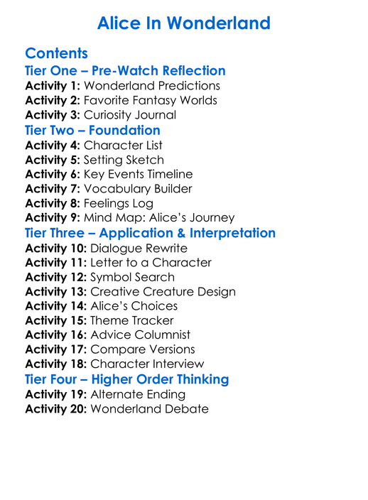 Alice In Wonderland Worksheet Activity Booklet