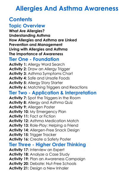 Allergies And Asthma Awareness Worksheet Activity Booklet