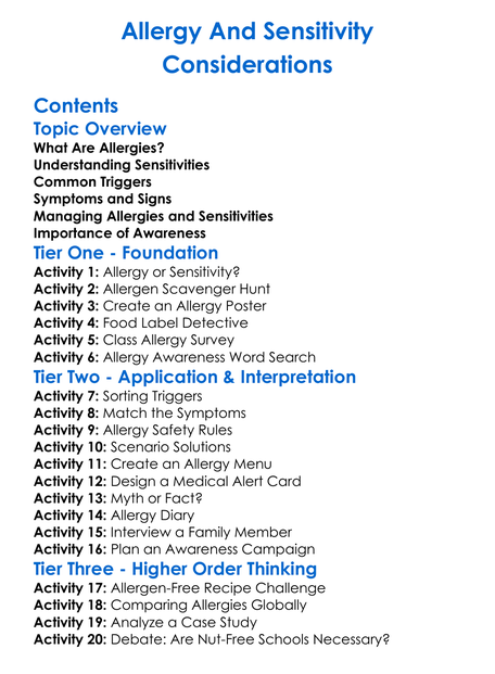 Allergy And Sensitivity Considerations Worksheet Activity Booklet