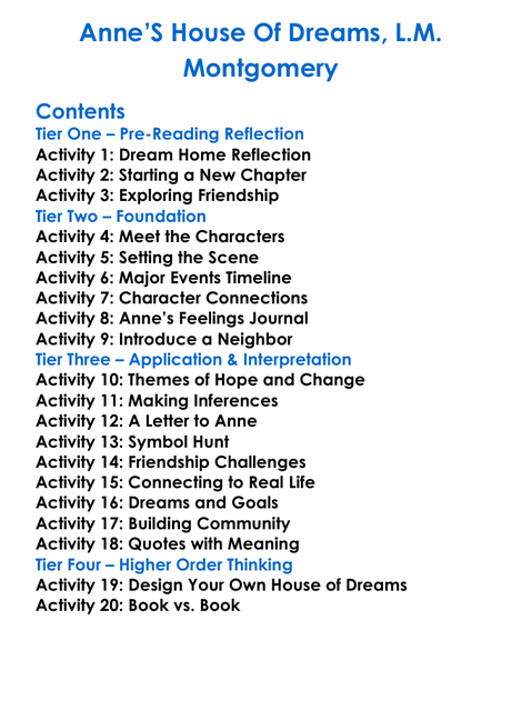 Annes House Of Dreams Lm Montgomery Worksheet Activity Booklet