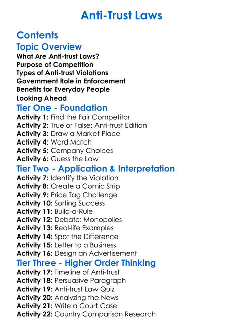 Anti-Trust Laws Worksheet Activity Booklet