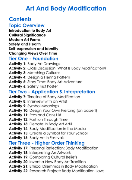 Art And Body Modification Worksheet Activity Booklet