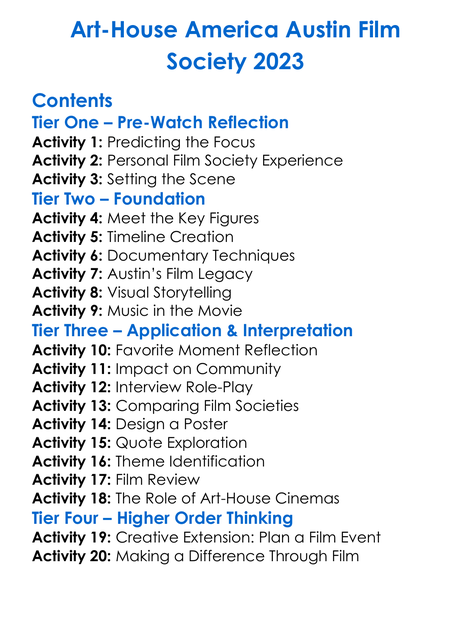 Art-House America Austin Film Society 2023 Worksheet Activity Booklet