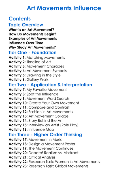 Art Movements Influence Worksheet Activity Booklet