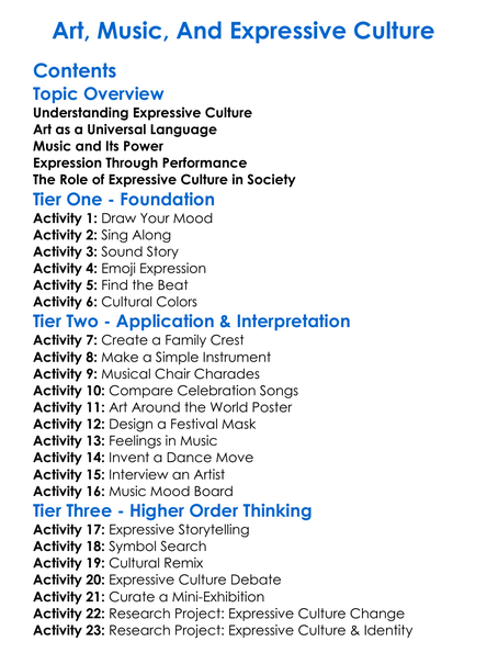 Art Music And Expressive Culture Worksheet Activity Booklet