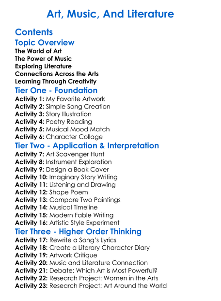 Art Music And Literature Worksheet Activity Booklet
