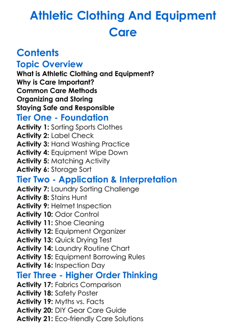 Athletic Clothing And Equipment Care Worksheet Activity Booklet