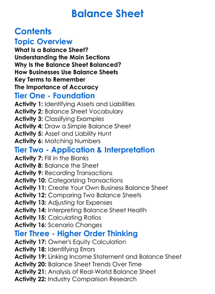 Balance Sheet Worksheet Activity Booklet