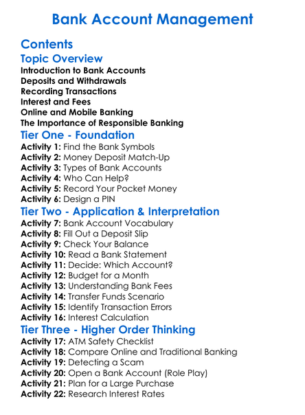 Bank Account Management Worksheet Activity Booklet