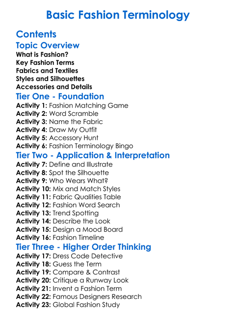 Basic Fashion Terminology Worksheet Activity Booklet