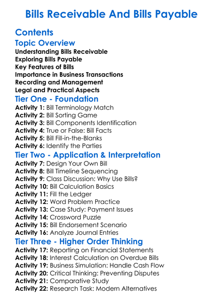 Bills Receivable And Bills Payable Worksheet Activity Booklet