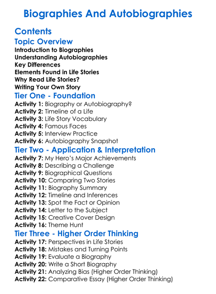 Biographies And Autobiographies Worksheet Activity Booklet