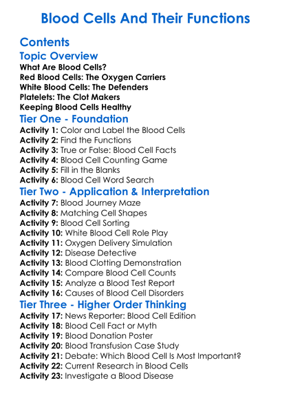 Blood Cells And Their Functions Worksheet Activity Booklet