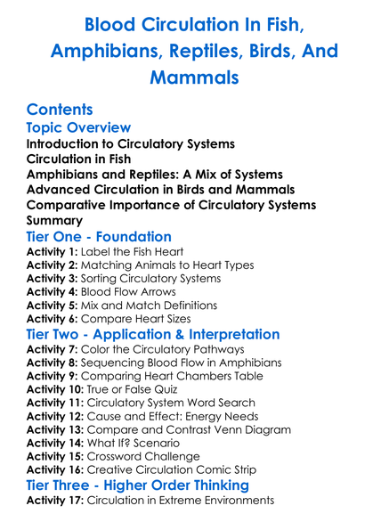 Blood Circulation In Fish Amphibians Reptiles Birds And Mammals Worksheet Activity Booklet