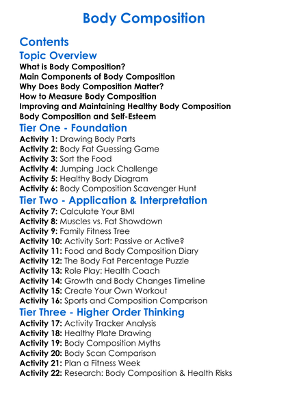 Body Composition Worksheet Activity Booklet