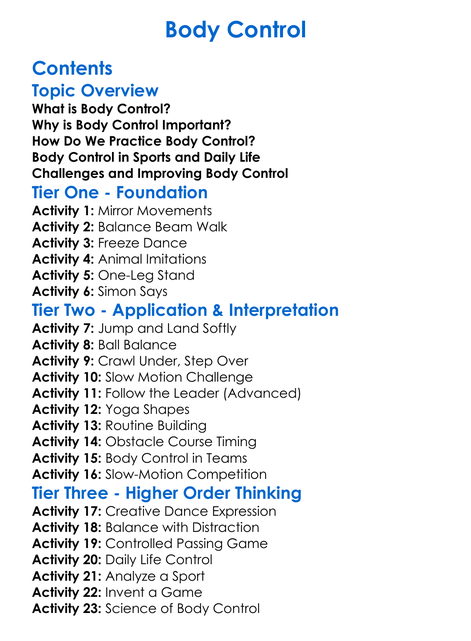 Body Control Worksheet Activity Booklet