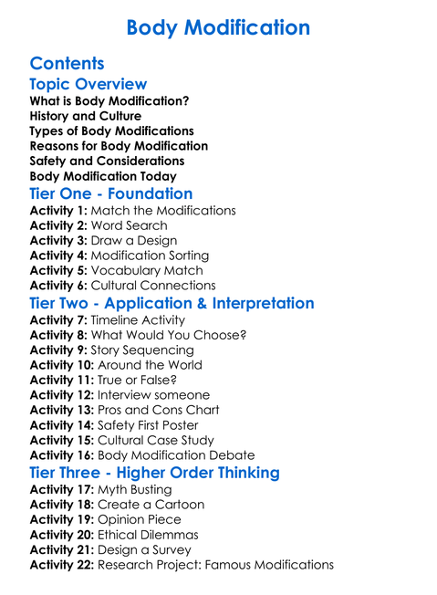 Body Modification Worksheet Activity Booklet