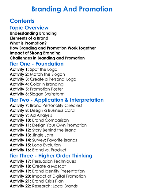 Branding And Promotion Worksheet Activity Booklet