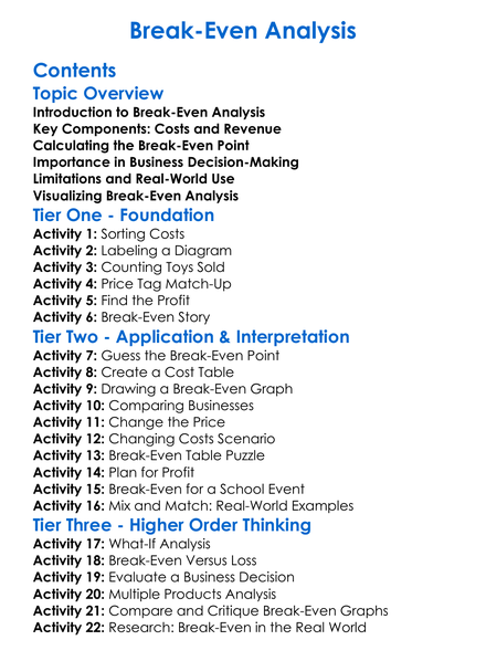 Break-Even Analysis Worksheet Activity Booklet