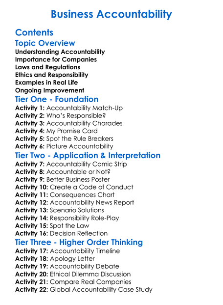 Business Accountability Worksheet Activity Booklet