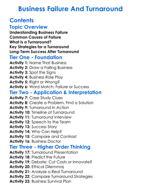 Business Failure And Turnaround Worksheet Activity Booklet