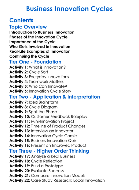 Business Innovation Cycles Worksheet Activity Booklet