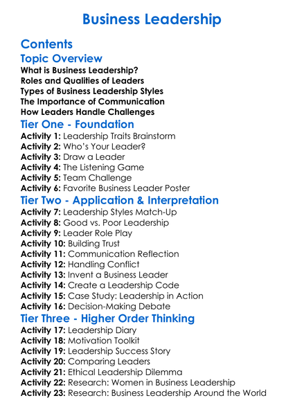 Business Leadership Worksheet Activity Booklet
