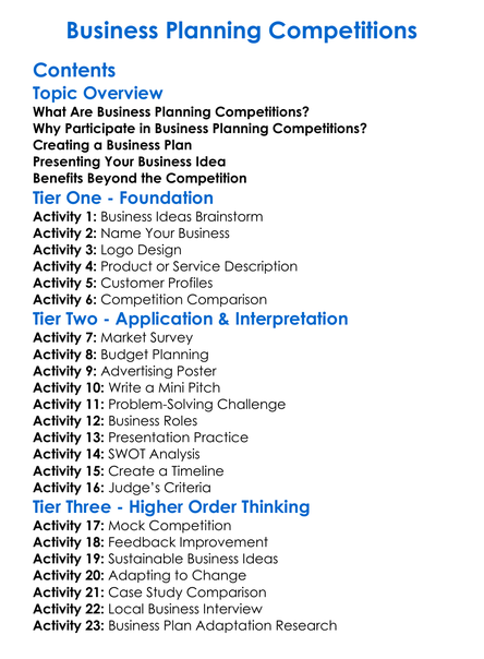 Business Planning Competitions Worksheet Activity Booklet