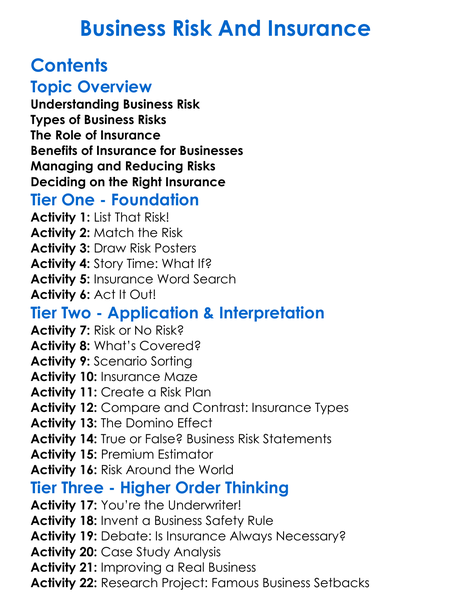 Business Risk And Insurance Worksheet Activity Booklet