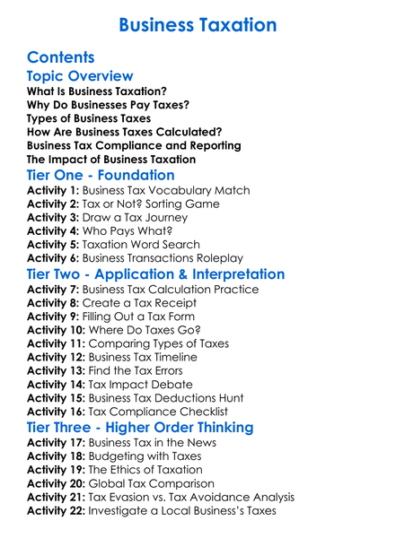 Business Taxation Worksheet Activity Booklet