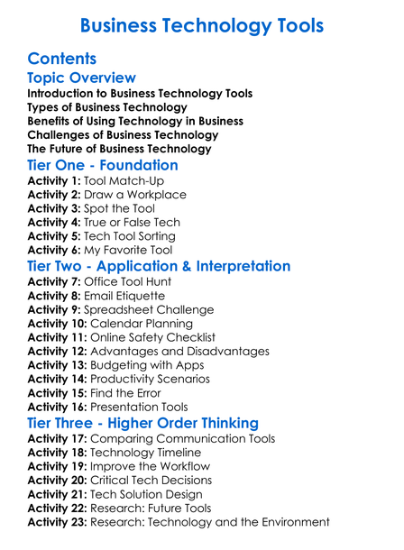 Business Technology Tools Worksheet Activity Booklet