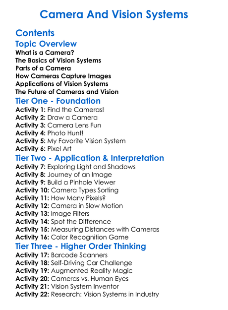 Camera And Vision Systems Worksheet Activity Booklet