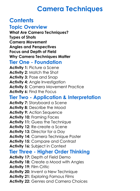 Camera Techniques Worksheet Activity Booklet