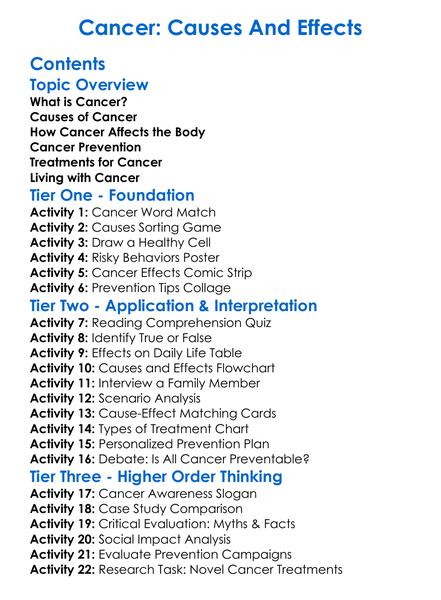 Cancer Causes And Effects Worksheet Activity Booklet