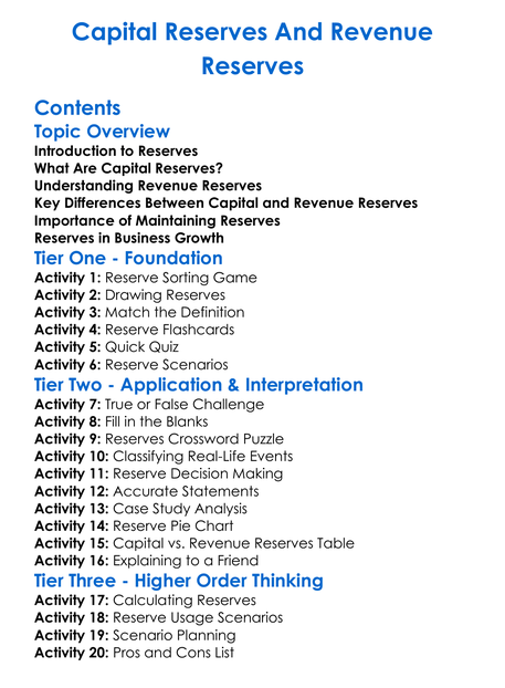 Capital Reserves And Revenue Reserves Worksheet Activity Booklet