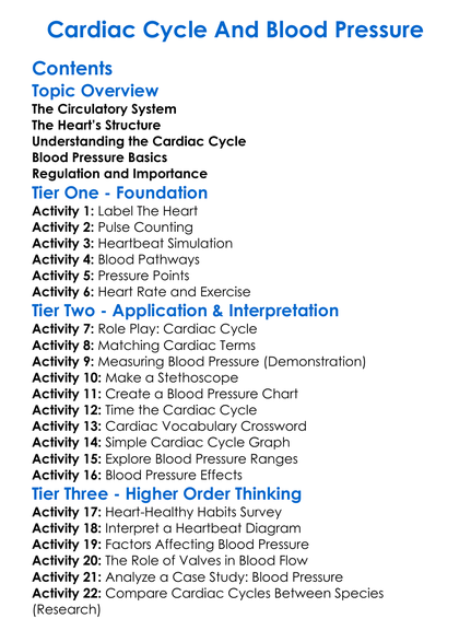 Cardiac Cycle And Blood Pressure Worksheet Activity Booklet