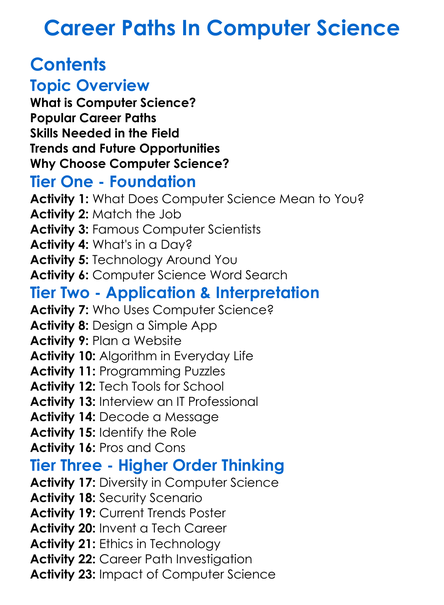 Career Paths In Computer Science Worksheet Activity Booklet