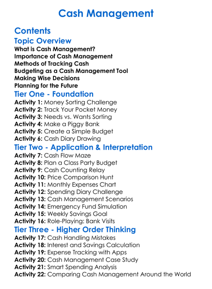 Cash Management Worksheet Activity Booklet