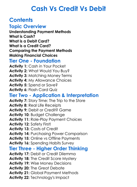 Cash Vs Credit Vs Debit Worksheet Activity Booklet
