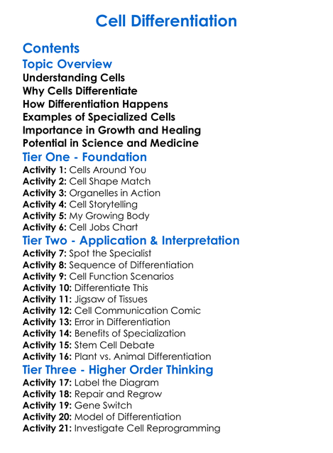 Cell Differentiation Worksheet Activity Booklet